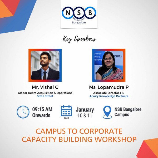 NSB Bangalore's "Campus to Corporate Workshop" connected our finance students with industry leaders Mr. Vishal C, Global Talent Acquisition & Operations at State Street and Ms. Lopamudra P, Associate Director-HR at Acuity Knowledge Partners with a unique opportunity to learn from the best in the industry. From valuable lessons to mock interviews! It was an all-rounded skill-boosting workshop for the students.